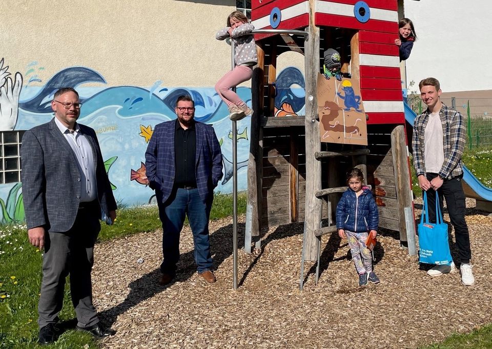 Für den Servicepunkt der Deutschen Glasfaser in Ranschbach gestalteten die Ranschbacher Kindergartenkinder ein Plakat, welches von einer kleinen Delegation der Kinder an Herrn Drawer, Projektmanager FTTH Deutsche Glasfaser, auf dem Spielplatz überreicht wurde.